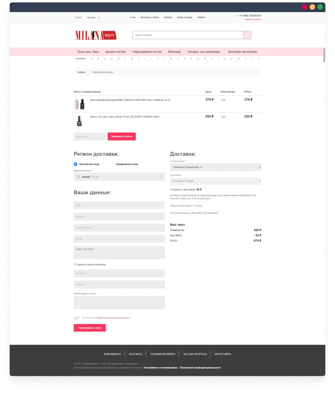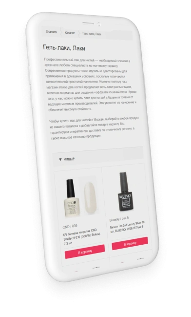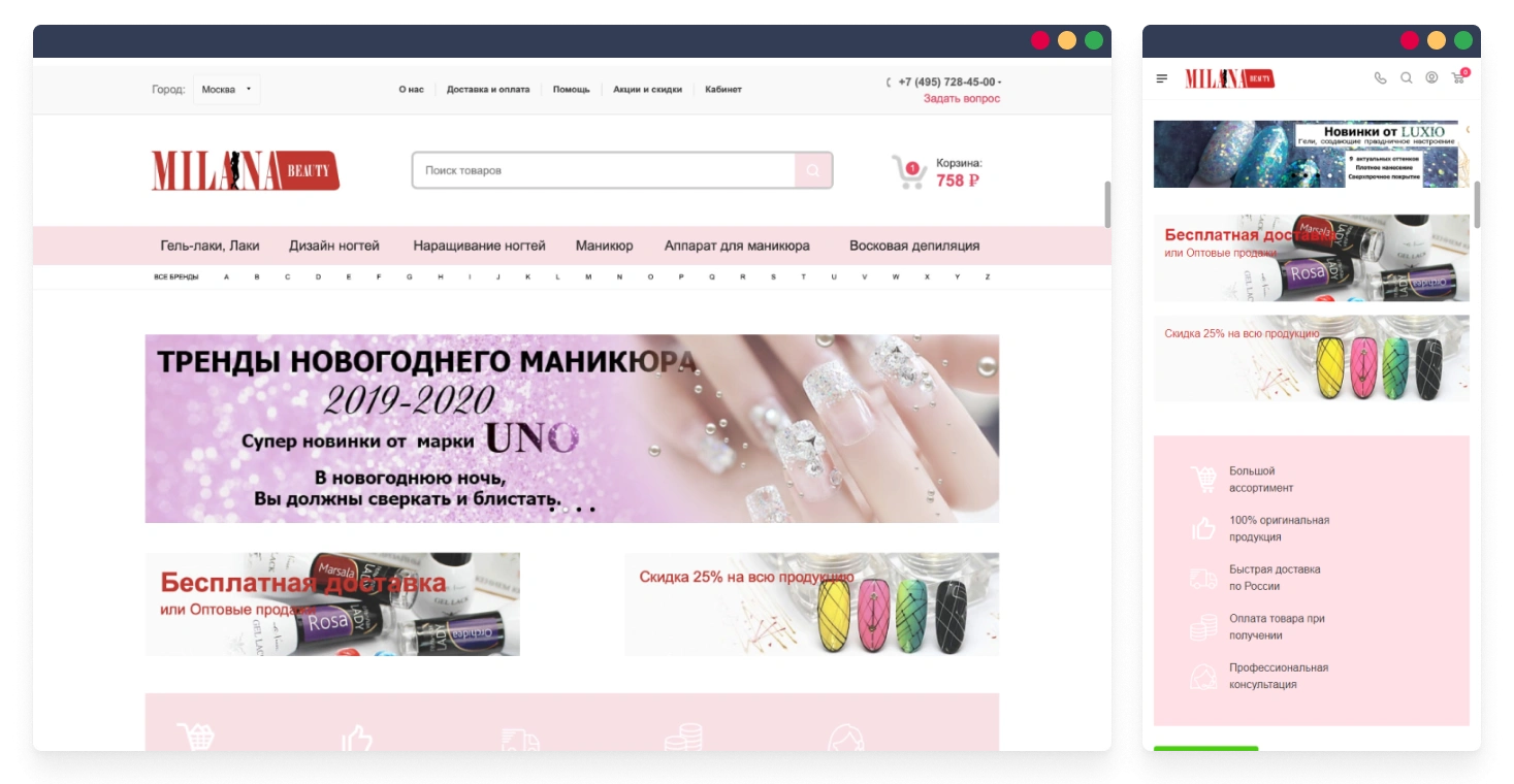 Милана Бьюти – это интернет-магазин профессиональных товаров для салонного ухода за руками. В магазине представлен широкий ассортимент гель-лаков, инструментов и материалов для дизайна ногтей, а также все для наращивания и маникюра. Магазин имеет более 5000 пунктов выдачи заказов, предлагает различные варианты доставки и реализует товары как в розницу, так и оптом.
